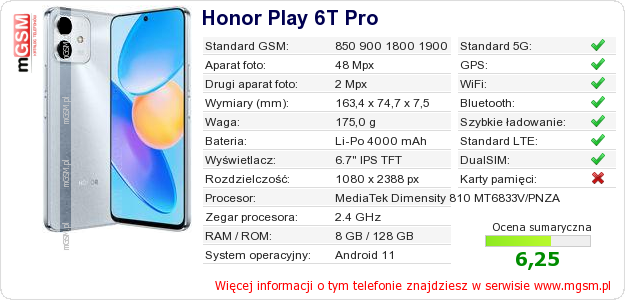 Dane telefonu Honor Play 6T Pro na Twojej stronie