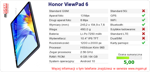Dane telefonu Honor ViewPad 6 na Twojej stronie
