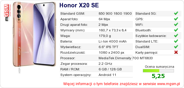 Dane telefonu Honor X20 SE na Twojej stronie