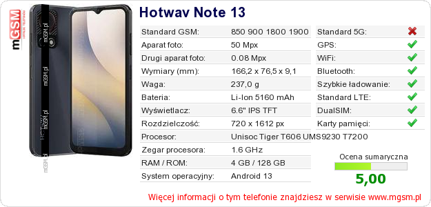 Dane telefonu Hotwav Note 13 na Twojej stronie