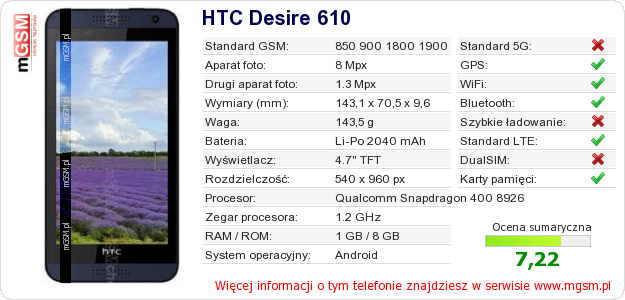 Dane telefonu HTC Desire 610 na Twojej stronie