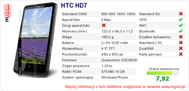 Dane telefonu HTC HD7 na Twojej stronie