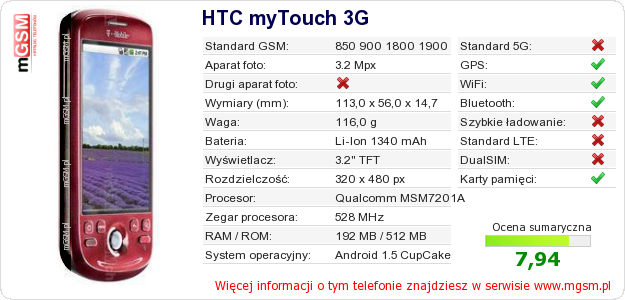 Dane telefonu HTC myTouch 3G na Twojej stronie