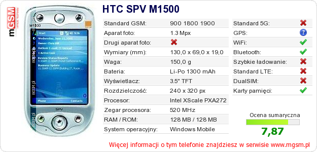 Dane telefonu HTC SPV M1500 na Twojej stronie