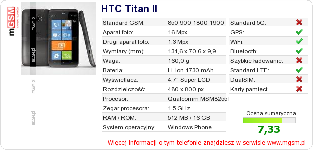 Dane telefonu HTC Titan II na Twojej stronie