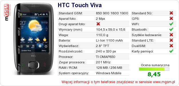 Dane telefonu HTC Touch Viva na Twojej stronie