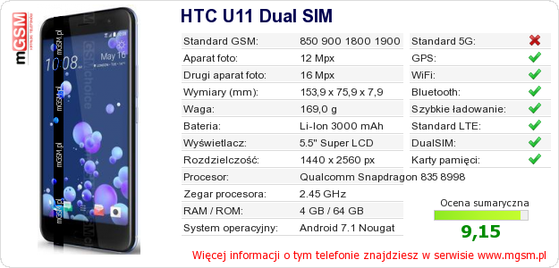 Dane telefonu HTC U11 Dual SIM na Twojej stronie