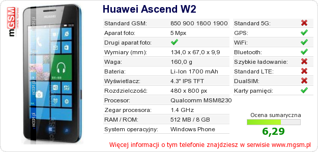 Dane telefonu Huawei Ascend W2 na Twojej stronie