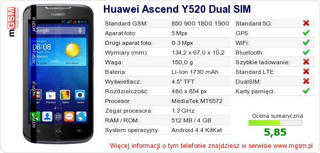 Dane telefonu Huawei Ascend Y520 Dual SIM na Twojej stronie
