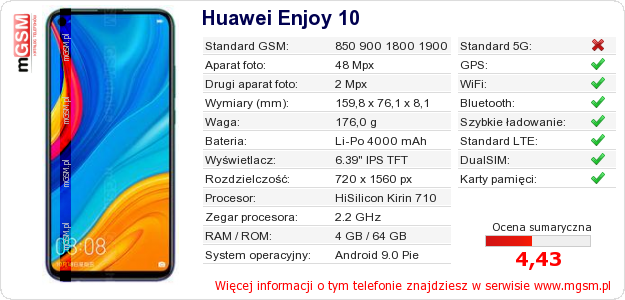 Dane telefonu Huawei Enjoy 10 na Twojej stronie