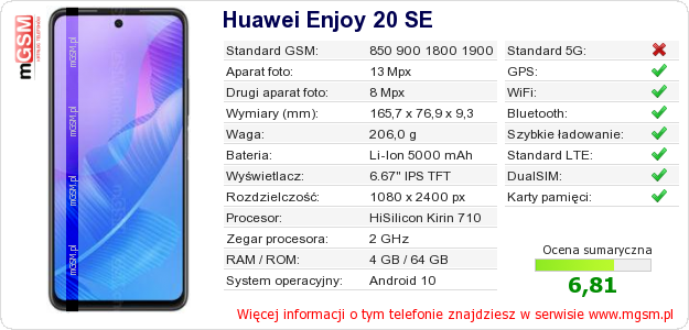 Dane telefonu Huawei Enjoy 20 SE na Twojej stronie
