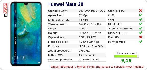 Dane telefonu Huawei Mate 20 na Twojej stronie