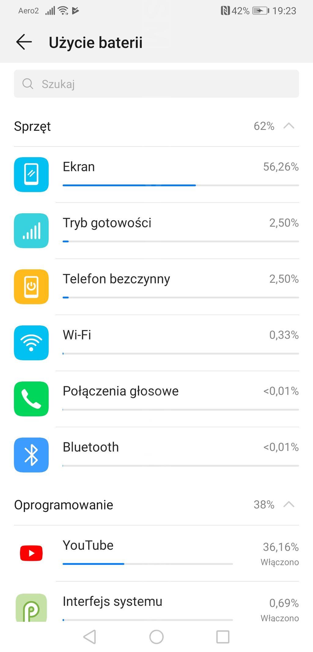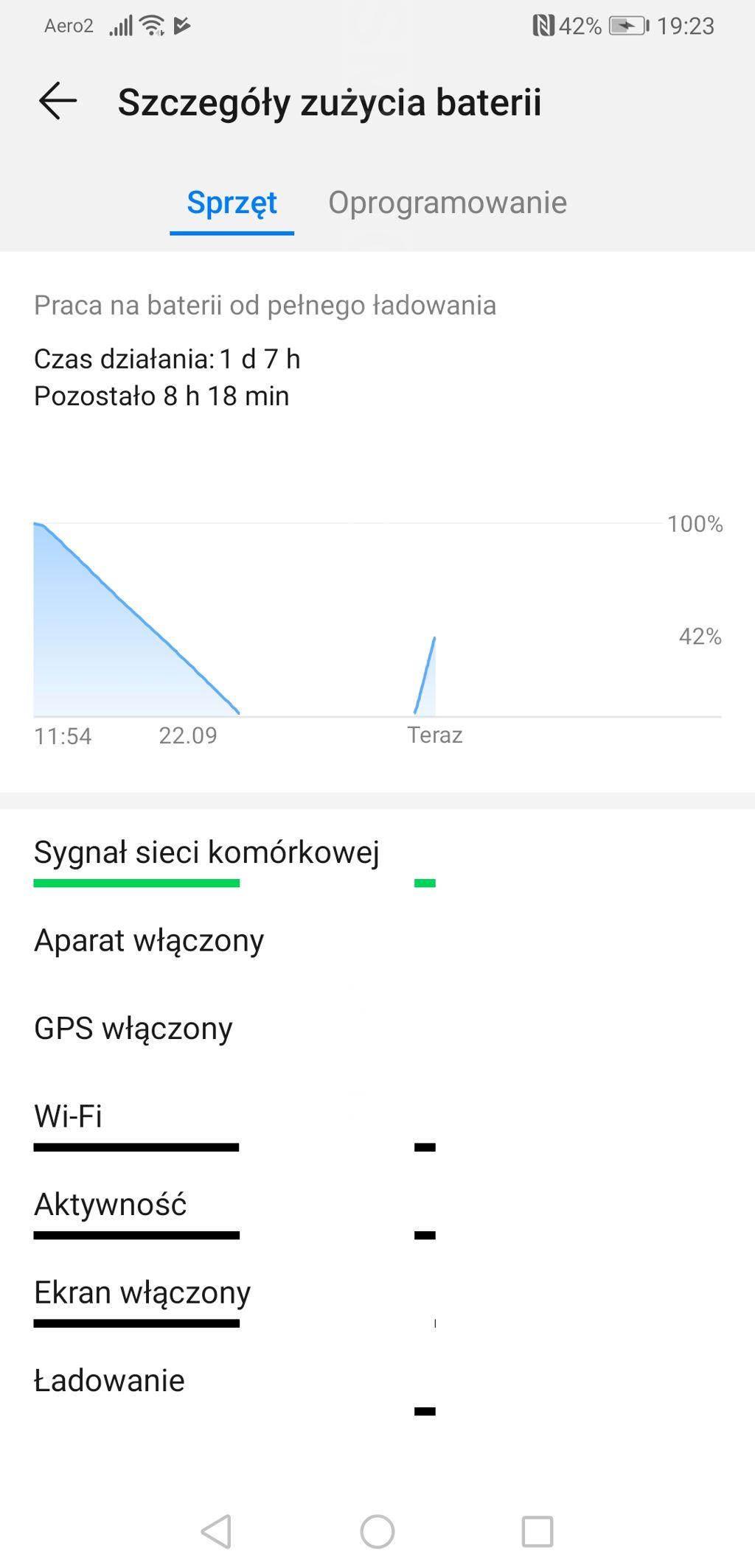 Za dostarczanie energii odpowiada bateria o pojemności 4200 mAh z funkcją szybkiego ładowania SuperCharge. Dodajmy, że "zwykły" Mate 20 X, pozbawiony 5G, ma większe ogniwo (5000 mAh). Wynika to z konieczności zmieszczenia wewnątrz obudowy dodatkowego modułu do łączności z siecią 5G - niestety kosztem baterii. Jak więc to pomniejszone ogniwo sprawuje się na co dzień? Zaskakująco dobrze. Obawiałam się szybkiego spadku stanu naładowania baterii ze względu na mocne podzespoły i wielki ekran, producent jednak skutecznie dopracował optymalizację zużycia energii. Uzyskiwałam na nim zazwyczaj 1-1,5 dnia pracy przy czasie pracy ekranu wynoszącym około 4-4,5 godziny. Warto pamiętać o wyłączeniu prądożernych aplikacji pracujących w tle oraz funkcji Always on Display - w godzinę, wyświetlając zegar, datę i ikonę baterii, stan naładowania potrafi spaść o 2-3%.