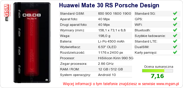 Dane telefonu Huawei Mate 30 RS Porsche Design na Twojej stronie
