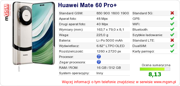 Dane telefonu Huawei Mate 60 Pro+ na Twojej stronie