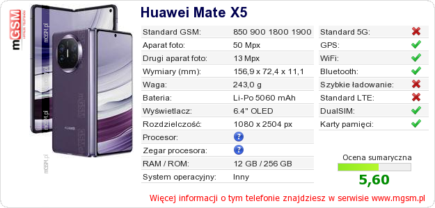 Dane telefonu Huawei Mate X5 na Twojej stronie