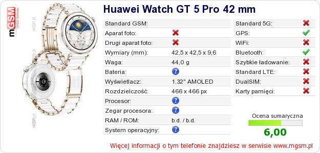 Dane telefonu Huawei Watch GT 5 Pro 42 mm na Twojej stronie