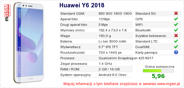 Dane telefonu Huawei Y6 2018 na Twojej stronie