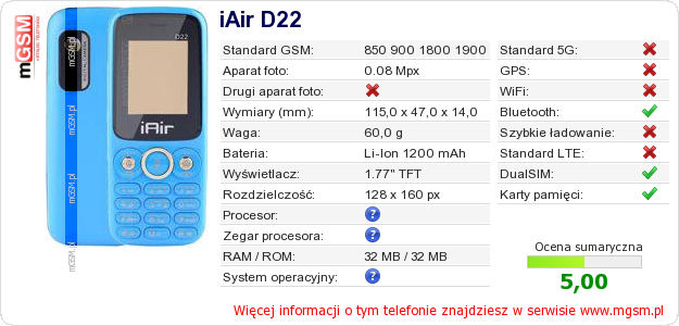 Dane telefonu iAir D22 na Twojej stronie