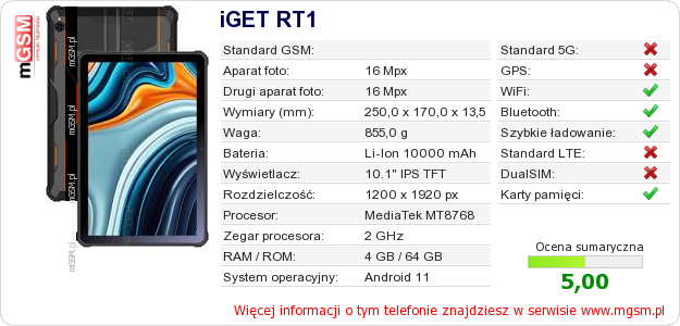 Dane telefonu iGET RT1 na Twojej stronie