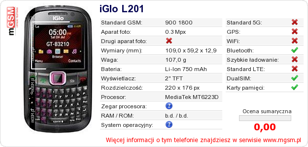 Dane telefonu iGlo L201 na Twojej stronie