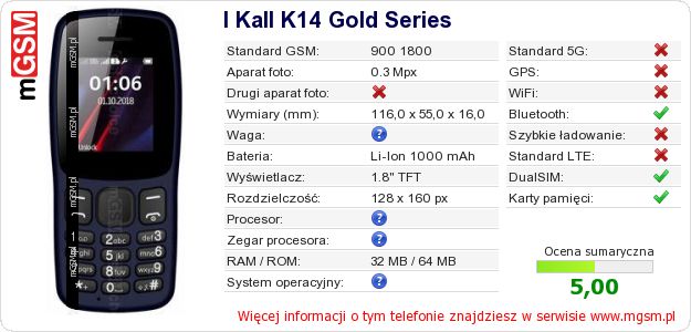 Dane telefonu I Kall K14 Gold Series na Twojej stronie