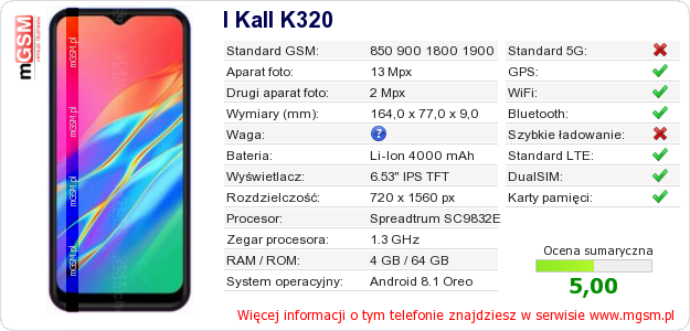 Dane telefonu I Kall K320 na Twojej stronie