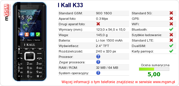 Dane telefonu I Kall K33 na Twojej stronie