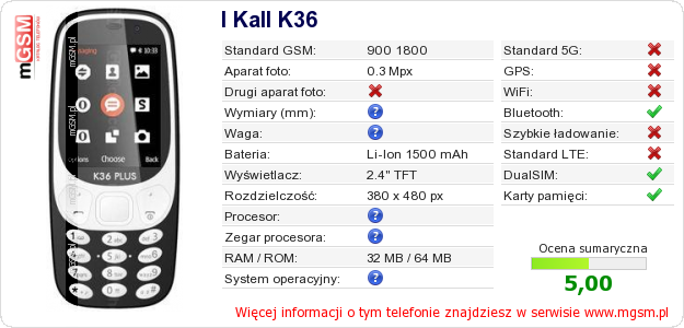 Dane telefonu I Kall K36 na Twojej stronie