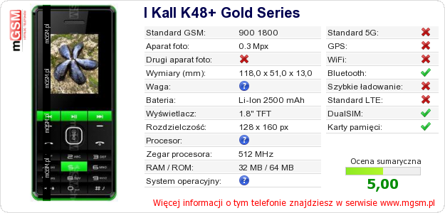 Dane telefonu I Kall K48+ Gold Series na Twojej stronie