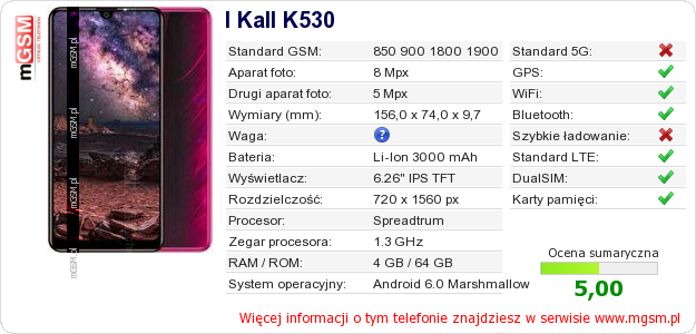 Dane telefonu I Kall K530 na Twojej stronie