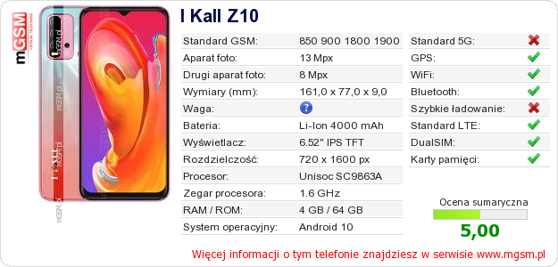 Dane telefonu I Kall Z10 na Twojej stronie