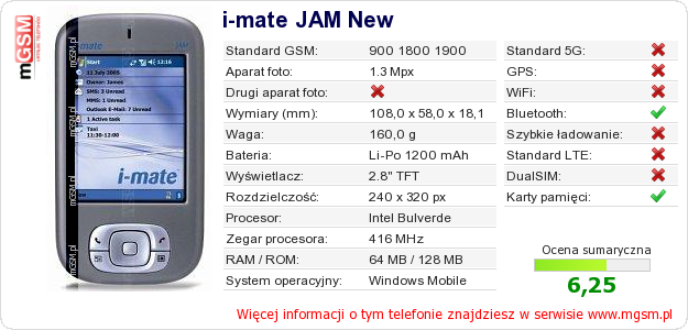 Dane telefonu i-mate JAM New na Twojej stronie