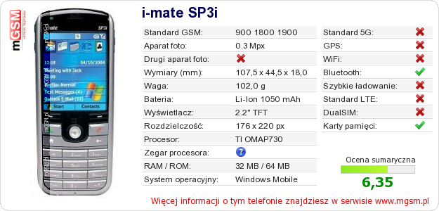 Masz swoją stronę? Chcesz wstawić gdzieś informacje o podstawowych danych telefonu i-mate SP3i ? To bardzo proste. Możesz pobrać obrazek, lub skopiować i wkleić na stronę poniższy kod:Wklejenie tego kodu spowoduje wyświetlenie poniższego obrazka: