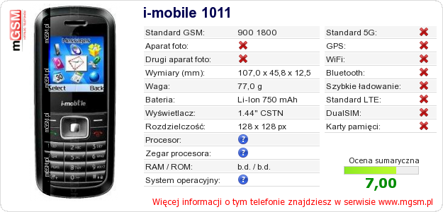 Dane telefonu i-mobile 1011 na Twojej stronie