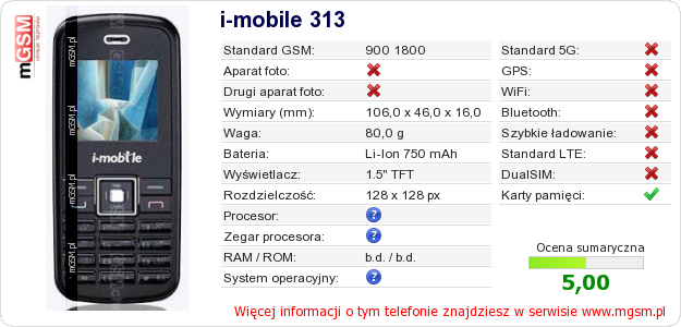 Dane telefonu i-mobile 313 na Twojej stronie