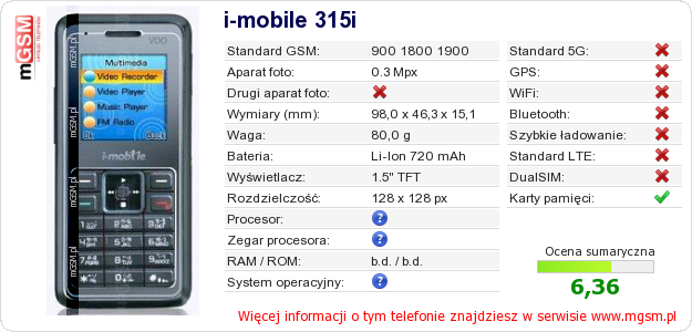 Dane telefonu i-mobile 315i na Twojej stronie