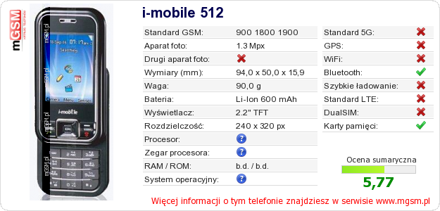 Dane telefonu i-mobile 512 na Twojej stronie