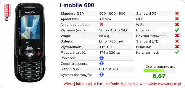 Dane telefonu i-mobile 600 na Twojej stronie
