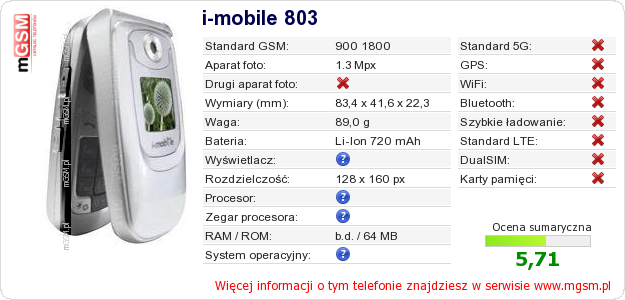 Dane telefonu i-mobile 803 na Twojej stronie