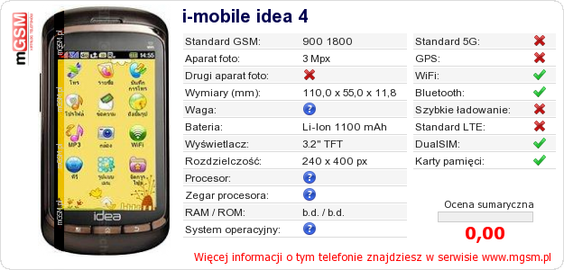 Dane telefonu i-mobile idea 4 na Twojej stronie