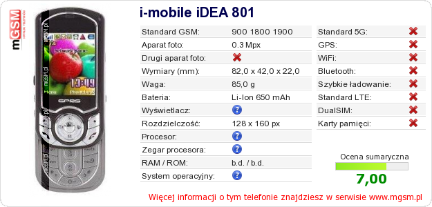 Dane telefonu i-mobile iDEA 801 na Twojej stronie