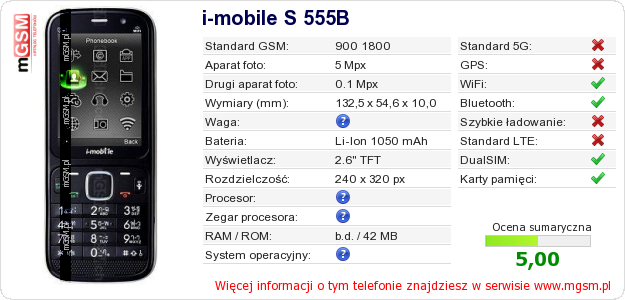 Dane telefonu i-mobile S 555B na Twojej stronie