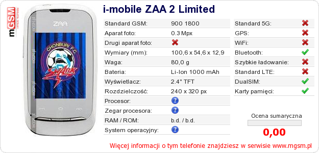 Masz swoją stronę? Chcesz wstawić gdzieś informacje o podstawowych danych telefonu i-mobile ZAA 2 Limited ? To bardzo proste. Możesz pobrać obrazek, lub skopiować i wkleić na stronę poniższy kod:Wklejenie tego kodu spowoduje wyświetlenie poniższego obrazka: