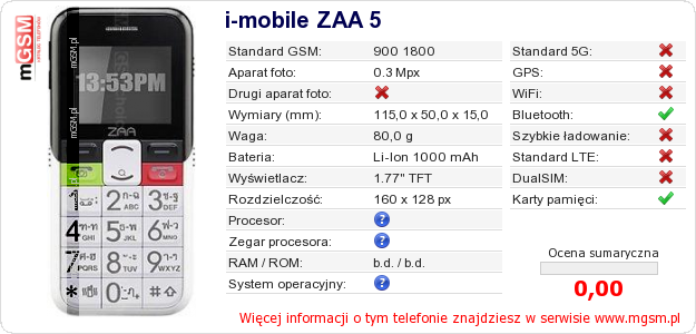 Dane telefonu i-mobile ZAA 5 na Twojej stronie