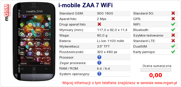 Dane telefonu i-mobile ZAA 7 WiFi na Twojej stronie