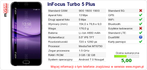 Dane telefonu InFocus Turbo 5 Plus na Twojej stronie