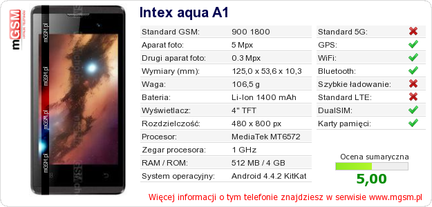 Dane telefonu Intex aqua A1 na Twojej stronie