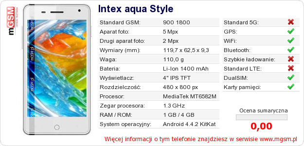 Dane telefonu Intex aqua Style na Twojej stronie