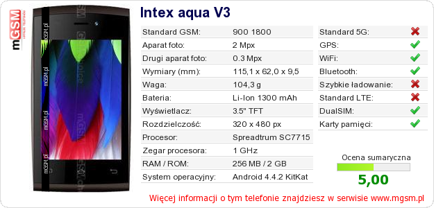 Dane telefonu Intex aqua V3 na Twojej stronie